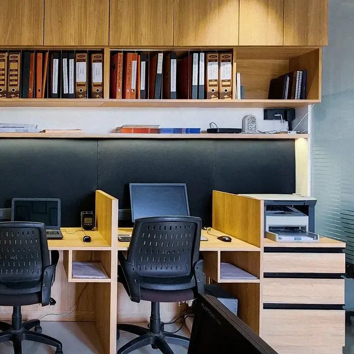 The aim for this project was to renovate an industrial office for Mr. Akshay Shukla. The goal was to create a sleek and modern office by taking advantage of the small space and making it appear roomy while managing staff desks efficiently.
